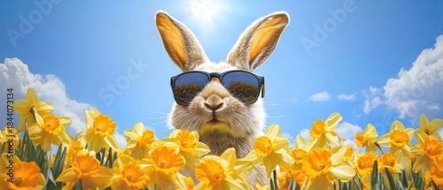 Fototapeta premium Playful rabbit with sunglasses peeking through bright yellow daffodils under a sunny blue sky, cheerful and relaxed