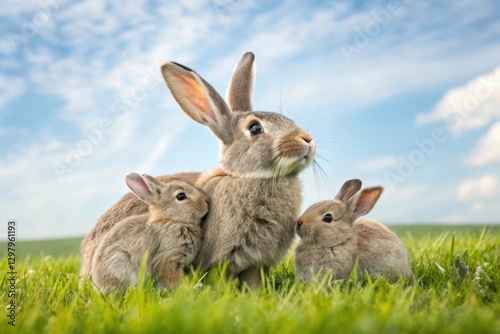 © Dinara, Fototapeta premium Playful rabbits basking in the sun on a bright spring day in a lush green meadow. Generative AI