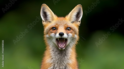 © Alfida, Fototapeta premium Playful red fox kit with mouth open, facing camera against blurred green background