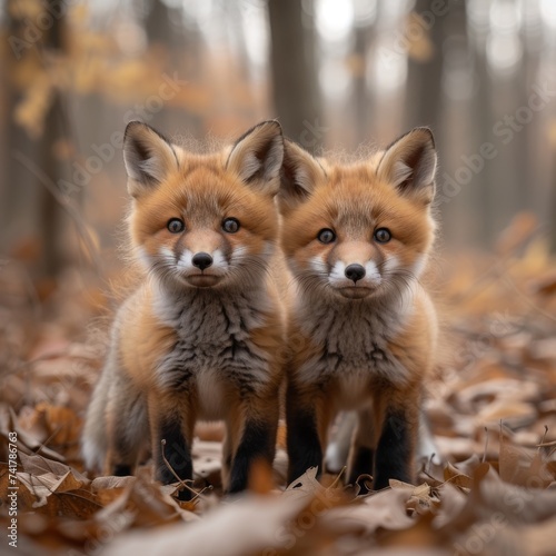 © Nico, Fototapeta premium Playful red fox kits exploring a woodland, showcasing curiosity and cuteness.