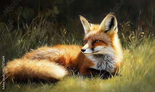 © Sergey, Obraz premium Playful red fox resting in a sunlit meadow, its vibrant fur glowing warmly under soft natural light for an endearing wildlife portrait