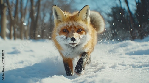 © AGUNG, Naklejka premium Playful red fox running through snowy forest.