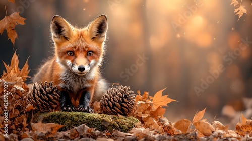 © Heng Heng - AI Stock, Fototapeta premium Playful red fox standing on a moss covered rock in a peaceful woodland setting surrounded by golden autumn leaves The image captures the tranquil and serene atmosphere of the natural environment