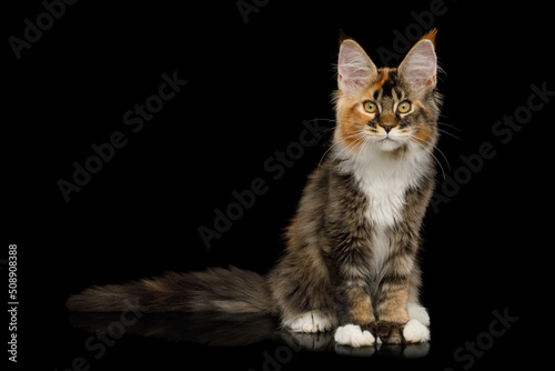 Obraz premium Playful red maine coon cat with polydactyl paws sitting on Isolated black background