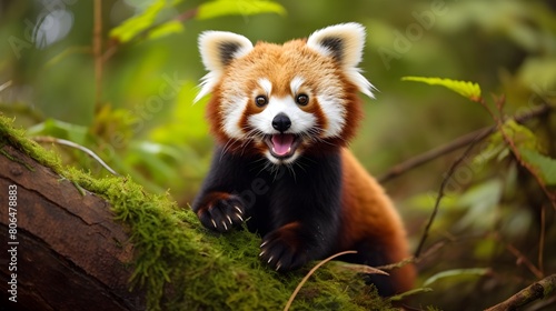 © Visual Aurora, Naklejka premium Playful red panda caught mid-roll, bushy tail and carefree expression,
