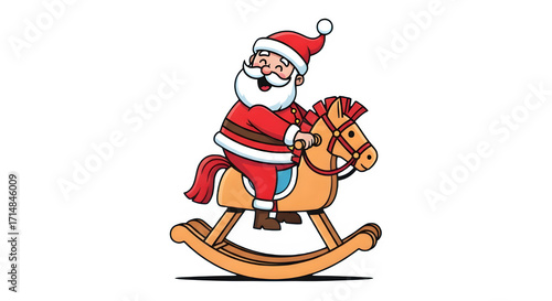 © Sasini, Obraz premium Playful Santa Claus Riding Rocking Horse – Christmas Cartoon Vector