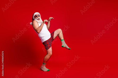 © deagreez, Obraz premium Playful Santa look alike dances in bright red studio wearing white tank top plaid shorts and striped socks for festive christmas vibe