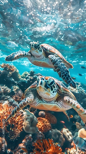 Fototapeta premium Playful Sea Turtles Swimming Through Vibrant Coral Reef in Clear Ocean Water