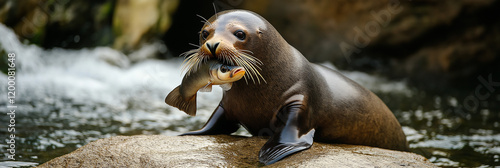 © Irina, Obraz premium Playful seal resting on rock with fish, cheerful nature scene