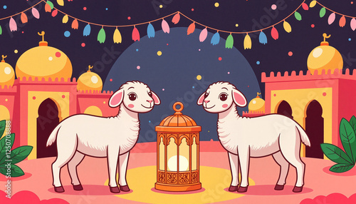 © Kseniya, Obraz premium Playful sheep beside glowing lantern in vibrant town square, Eid al-Adha