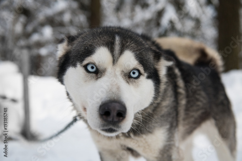 Naklejka premium Playful siberian husky with blue eyes (focus is on the eyes)