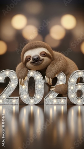 © KomsyahDisplay, Fototapeta premium Playful sloth with festive 2020 digits and glowing bokeh lights.