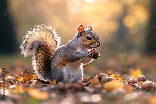 Obraz premium Playful squirrel collecting acorns