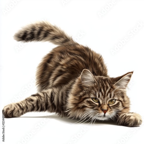 © Pornnapha, Obraz premium Playful Tabby Cat Stretching with Intriguing Expression in a Bright Studio Setting