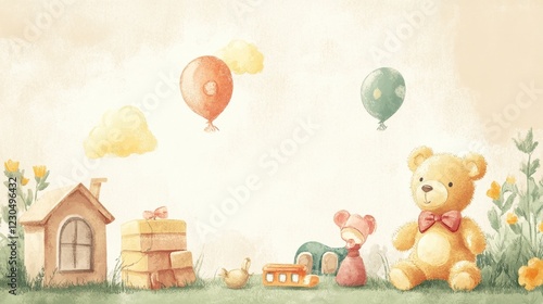 © NpicArt, Obraz premium Playful Teddy Bear Scene with Toys and Balloons