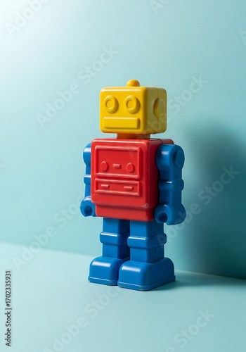 © Subejos, Fototapeta premium Playful toy robot figure casting a shadow on a blue gradient backdrop