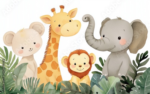 © Wimon, Naklejka premium Playful watercolor jungle animals, baby giraffes, an elephant waving its trunk, a curious monkey, and a small lion cub, surrounded by tropical foliage, warm pastel hues
