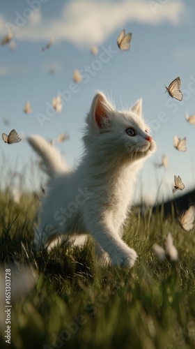 © InfinityArtCreator, Fototapeta premium Playful White Kitten Chasing Butterflies in a Serene Meadow