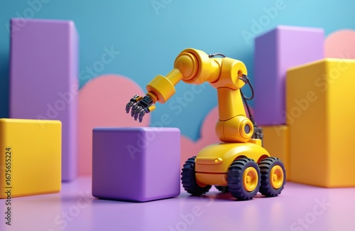 Obraz premium Playful yellow robot arm manipulates purple cube in vibrant geometric setting...