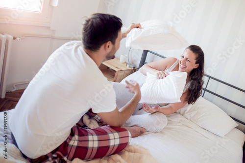 © ivanko80, Fototapeta premium Playful young couple having pillow fight on bed