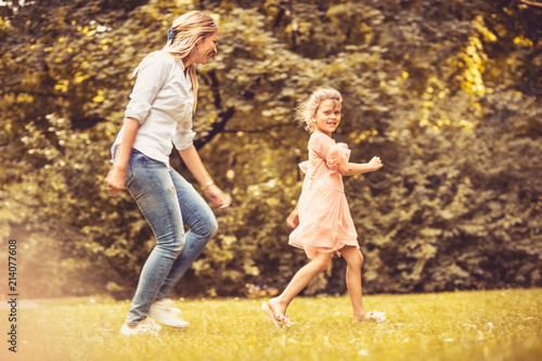 © liderina, Fototapeta premium Playing at meadow. Spring season. Mother and daughter.