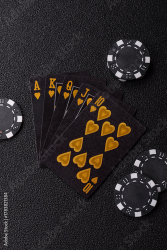 Obraz premium Playing card game poker in casino with chips, bets and risk. Cards and chips on black felt