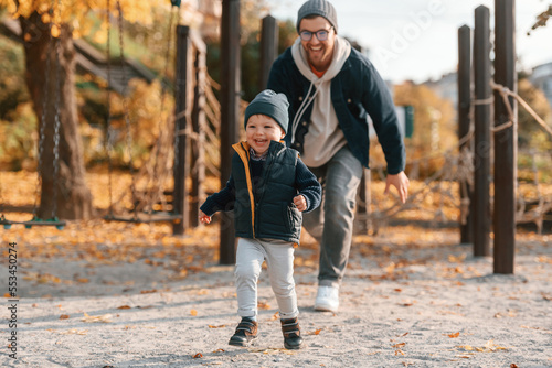 Fototapeta premium Playing, having fun together. Father and young son is together outdoors at daytime