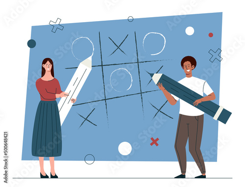 Fototapeta premium Playing noughts and crosses. Entertainment and joint pastime. Logic and cunning. Man and girl with pencil. Metaphor for business strategy and company development. Cartoon flat vector illustration