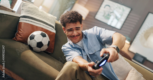 Fototapeta premium Playing, video games and man with controller, home and fun with virtual sport in living room and online sports. Apartment, gamer and person with tech for entertainment, streaming and player on couch