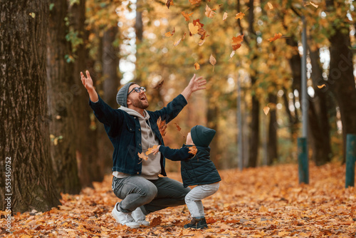 Fototapeta premium Playing with fallen leaves. Father and young son is together outdoors at daytime