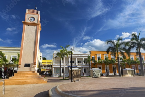 © Autumn Sky, Fototapeta premium Plaza Del Sol Town Square and Tower Clock in Downtown San Miguel near Cruise Ship Port in Cozumel Mexico, Yucatan Peninsula