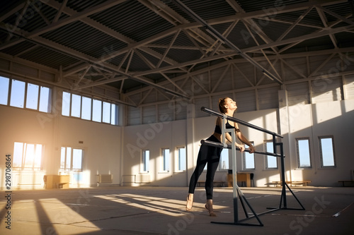 Fototapeta premium Pleasant young female athlete training at ballet bar, standing on tiptoe,...