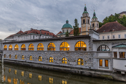 © Matyas Rehak, Obraz premium Plecnik arcade market building reflecting in Ljubljanica river in Ljubljana, Slovenia