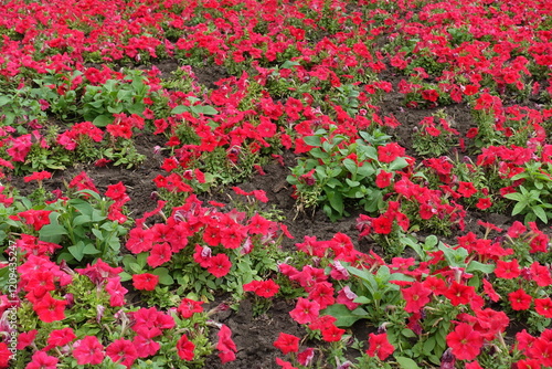 Fototapeta premium Plentiful scarlet red flowers of petunias in August