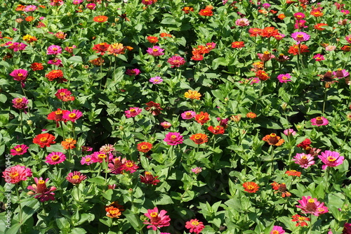 Fototapeta premium Plenty of red, pink, magenta, orange, yellow flowers of zinnia