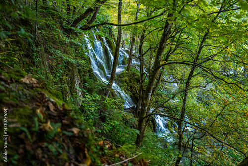 © Volodymyr, Fototapeta premium Plitvice Lakes National Park. Croatia. Big waterfalls. Nature travel background. Beautiful nature. Plitvice waterfalls in Croatia. Mountain streams flow into a lake with azure clear water.