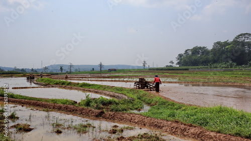 © onyengradar, Fototapeta premium Plough and in background is ripe rice paddy cow plowing field