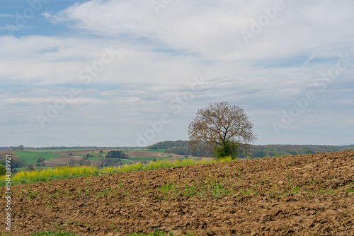 Obraz premium Plowed farmland with brown soil and a blue sunny sky
