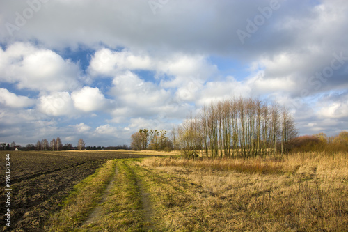 Fototapeta premium Plowed field, road and copse