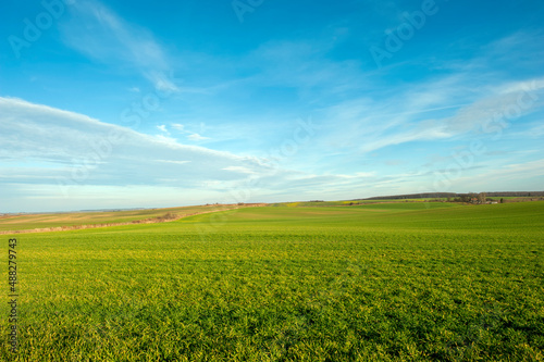 © mikhailgrytsiv, Fototapeta premium Plowed field under the background of blue sky