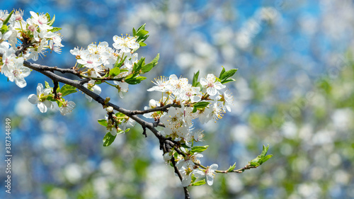 Obraz premium Plum branch with flowers in spring in sunny weather
