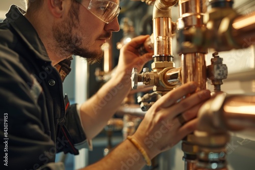 © spyrakot, Obraz premium Plumber Installing Copper Pipes in Residential Basement - Detailed Soldering Process Close-Ups for Installation Guide