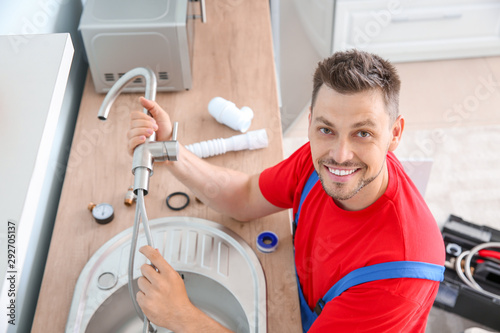 © Pixel-Shot, Obraz premium Plumber installing sink in kitchen