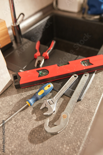 Fototapeta premium Plumber tools for fixing and repairing water tap on the kitchen sink.