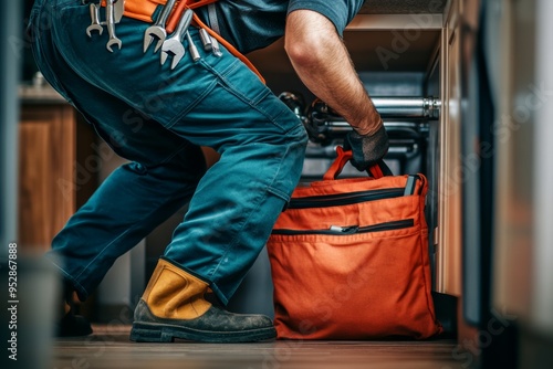 © Gromik, Fototapeta premium Plumber working under kitchen sink with tool bag on the floor