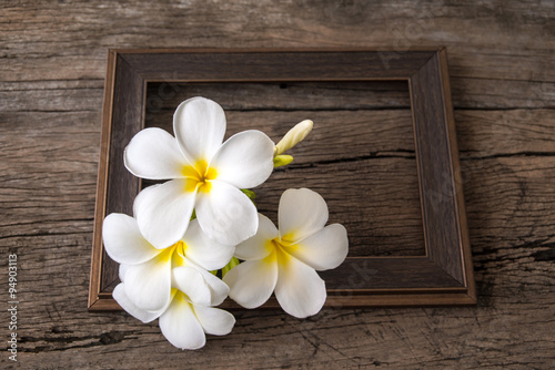 © fotobieshutterb, Naklejka premium Plumeria flower on wood and picture frame