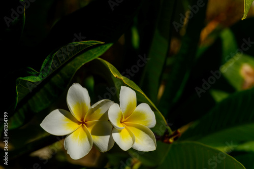 Fototapeta premium Plumeria flower. yellow and white frangipani tropical flora, plumeria blossom blooming on tree.