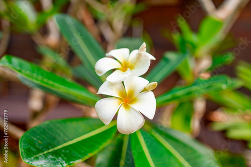 © klavdiyav, Fototapeta premium plumeria frangipani bush on tropical island, nature background