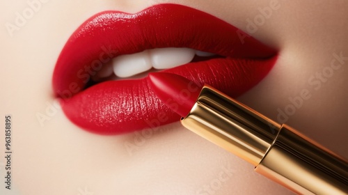 © Pixora Labs, Obraz premium Plump lips with red lipstick, macro photography