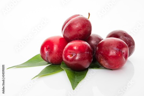 © EwaStudio, Fototapeta premium plums with plum leaves on a white background